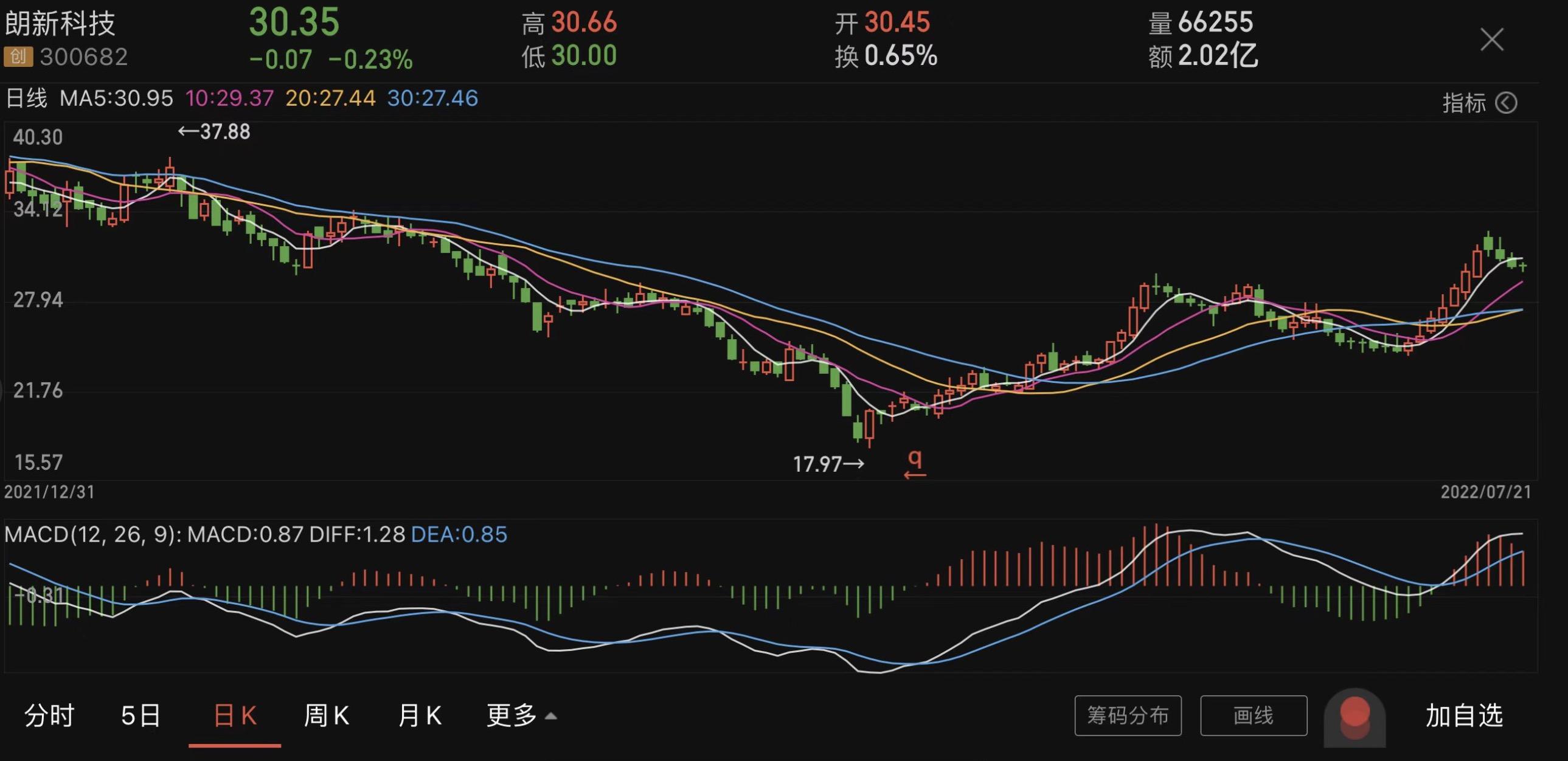 然而,市场的表现继续“打脸”。业绩预告发布后,朗新科技结束了之前7连涨的走势,7月18日(周一)以来连收4根阴线,股价从31.60元跌至30.35元,区间跌幅为4.0%。