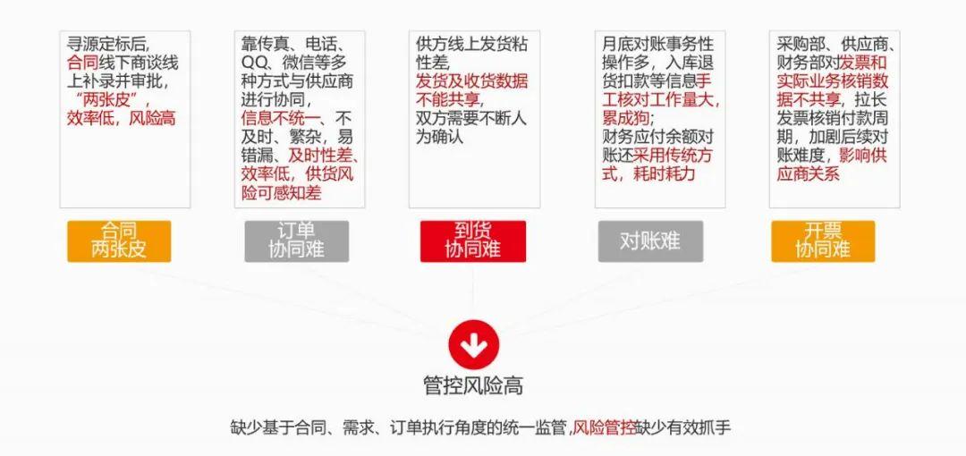 通过供应链协同全流程,实现需求管理、寻源、合同签订、订单生成、供应链协同,供应链门户一体化,从根本上解决信息断点问题。通过供应链一体化执行层面的管理,设置内控点和内控制度进行配合实现⻛控的管理。