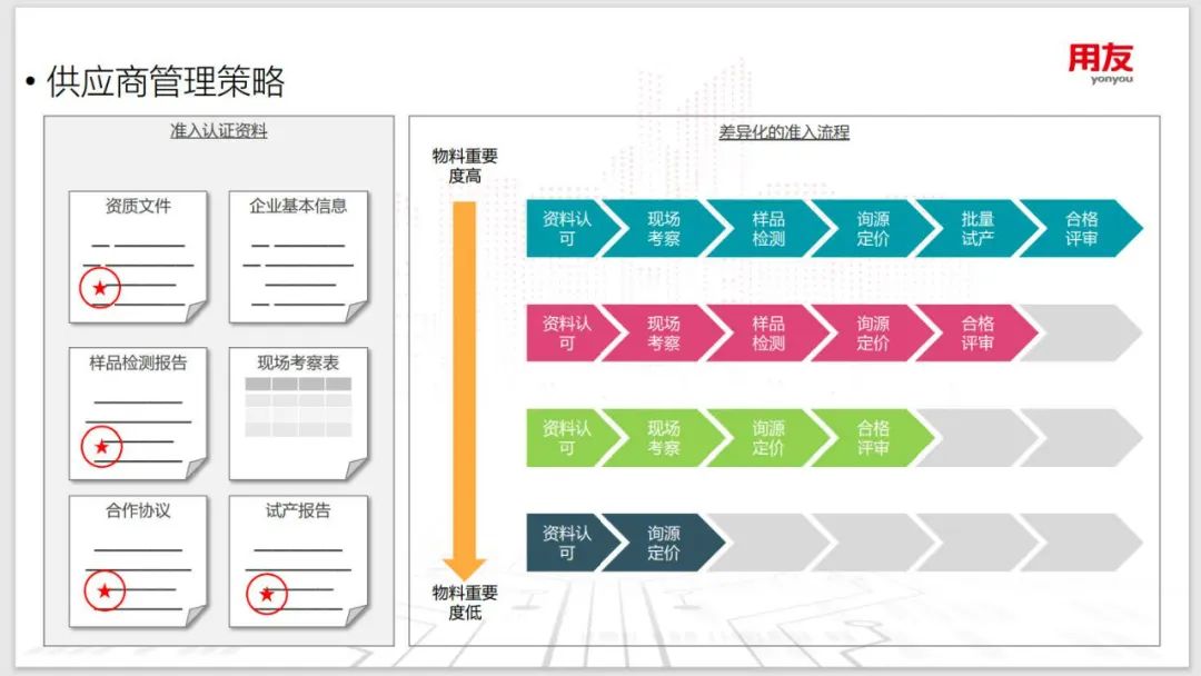 这是和现有ERP的供应商管理的巨大差异。这些差异为安钢供应商管理带来了全新的体验。改善了供应关系,将核心供方从买卖式关系向伙伴式关系转变,选拔战略合作伙伴,优化供应商节奏,减少贸易商,共同打造具有竞争力的供应链系统。参考物料品类的重要程度,制定了不同的准入流程和管理策略。