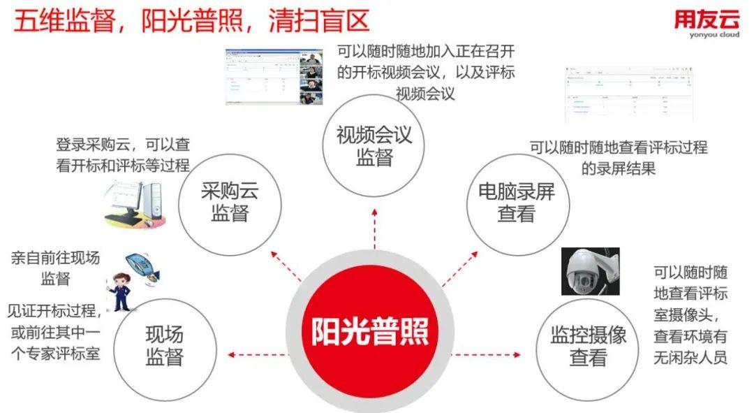 现有采购云系统+桌面监控和录制系统+视频会议云+摄像监控云,协同实现云开标与云评标。