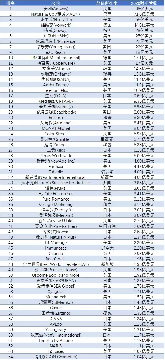 这份百强排行榜也是直销行业研究者、投资人以及从业人员的重要参考资料之一。榜单之外还有包括许多中国直销企业在内的年收入超过1亿美元的公司,但由于这些公司不公开2020年财务数据,因此未被列入本榜单。