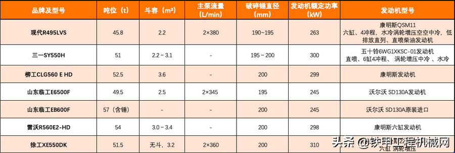 目前市面上已经有多款主打矿山破碎的产品,其中柳工表示其956 E HD挖掘机是业内同吨级产品中,机重最大、排量最大、挖掘力最大的挖掘机。我们来对比一下这些“打锤机”的参数。