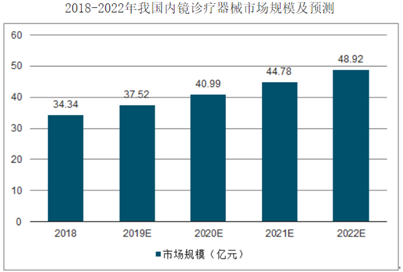 内窥镜市场快速增长,是驱动内镜器械耗材需求不断增加的主要动力。2017年全球内镜诊疗器械市场规模为50亿美元,预计未来三年复合增长率为5%,2020年市场规模有望达到接近60亿美元。