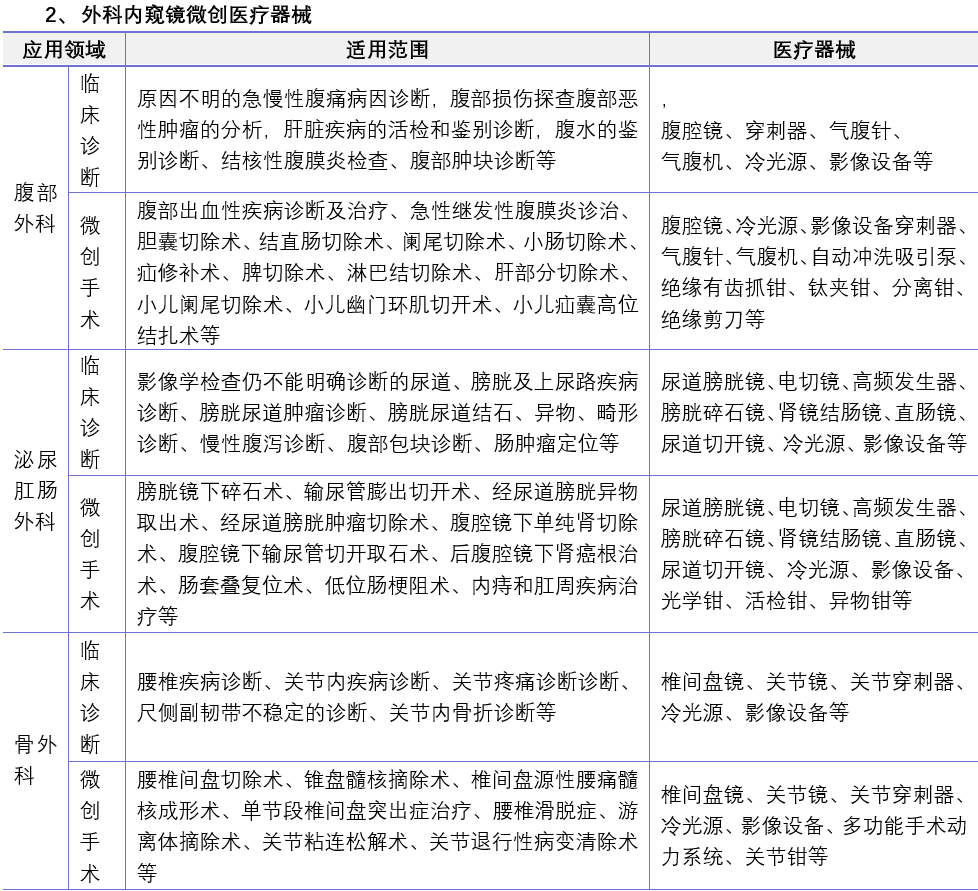 公司生产的内窥镜微创医疗器械为由医用内窥镜、微创手术器械和配套设备组成的内窥镜微创诊疗系统,按科室主要分为耳鼻喉科内窥镜微创医疗器械、外科内窥镜微创医疗器械、妇科内窥镜微创医疗器械,其中外科内窥镜微创医疗器械主要包括腹部外科微创医疗器械、泌尿肛肠外科微创医疗器械、骨外科微创医疗器械等。为满足国内医疗机构不断增长的产品需求,公司加大研发投入,持续丰富产品种类,目前公司主要产品可分为3大系统,27个系列,涉及2,700多种规格型号的医用内窥镜和手术器械。