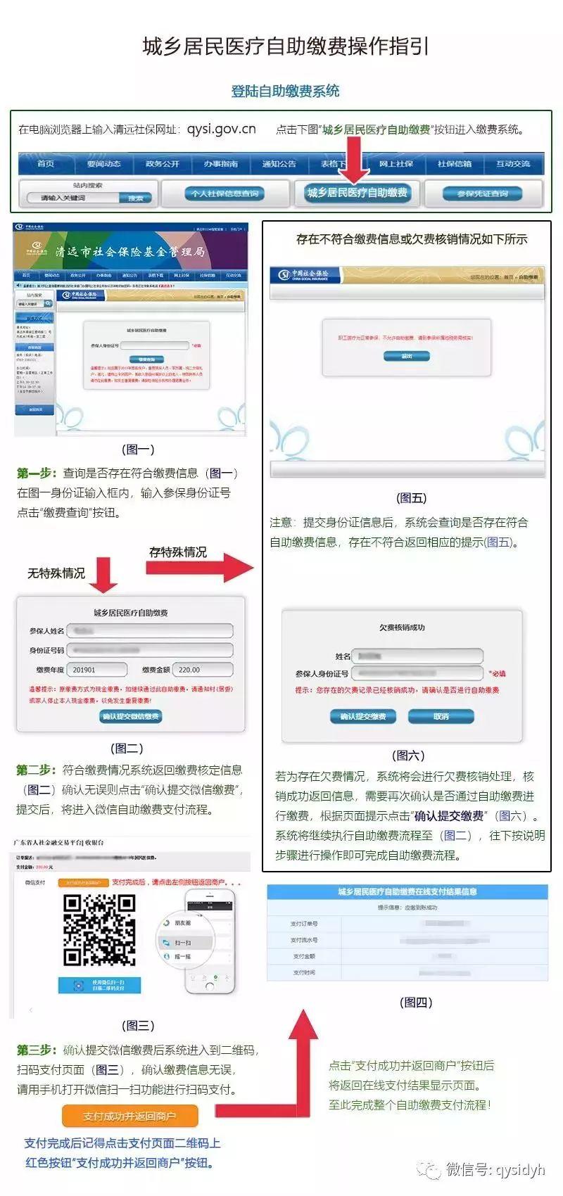 我市城乡居民医疗网上自助缴费功能已于市社保局官网上线。参保人只需在清远市社会保险基金管理局网站(www.qysi.gov.cn)录入身份证号码,即可通过微信扫一扫的方式进行缴费,缴费成功后,城乡居民医疗保险待遇于2019年1月1日起生效,无需等待银行集中扣款日或村居统一收费。目前,该功能只适用于续保人员(即原缴费方式为银行代扣或村集体现金缴费人员),新生儿或首次参保等人员仍需到社保经办机构办理。