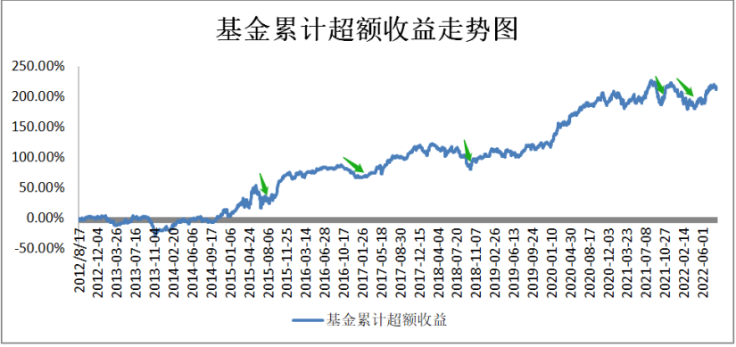从基金相比于偏股混合型基金指数的累计超额收益走势图来看,
