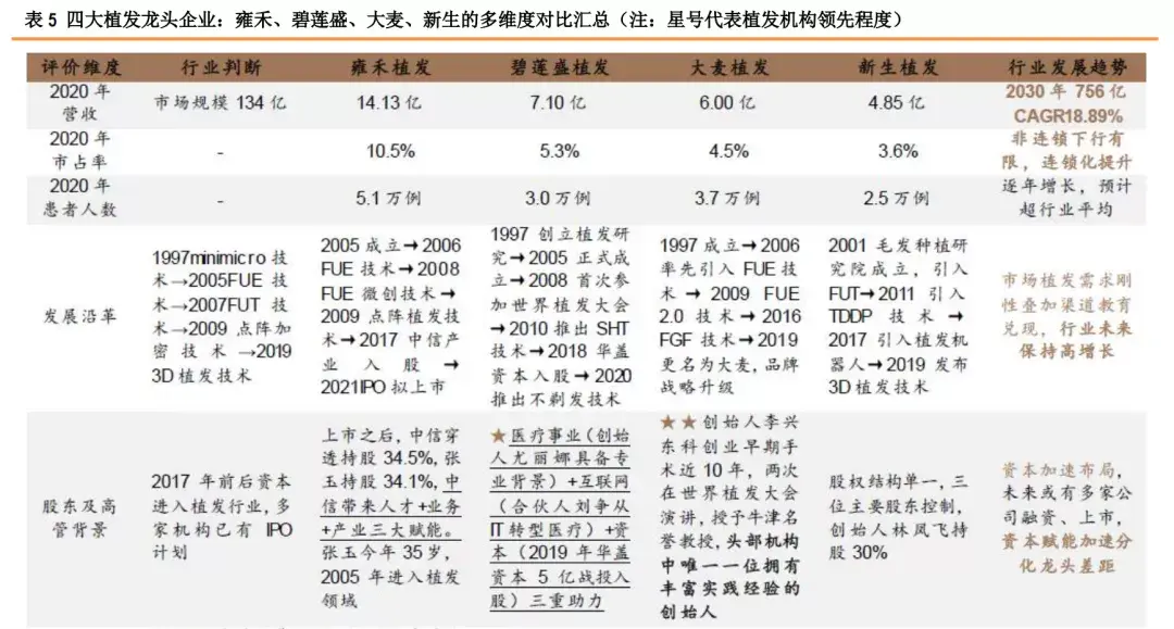 当前国内连锁型植发机构已出现雍禾、碧莲盛、大麦、新生等四大龙头企业,根据雍禾招股说明书披露,2020年四家机构的市场占有率分别为10.5%、5.3%、4.5%、3.6%,累计占比达23.9%。本篇作为植发系列第二篇,我们在章节二中对四大植发机构的发展沿革、股东管理层、营销投入、技术特点、医疗服务及布局版图等多维度进行细化分析,比较各龙头企业优劣势,推演植发竞争格局变迁。