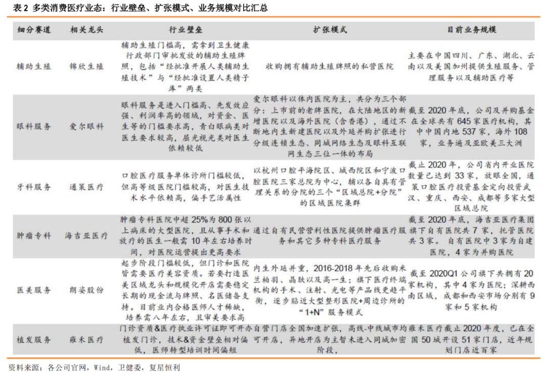 ▍1. 多种消费医疗业态对比,植发龙头格局将走向何方?