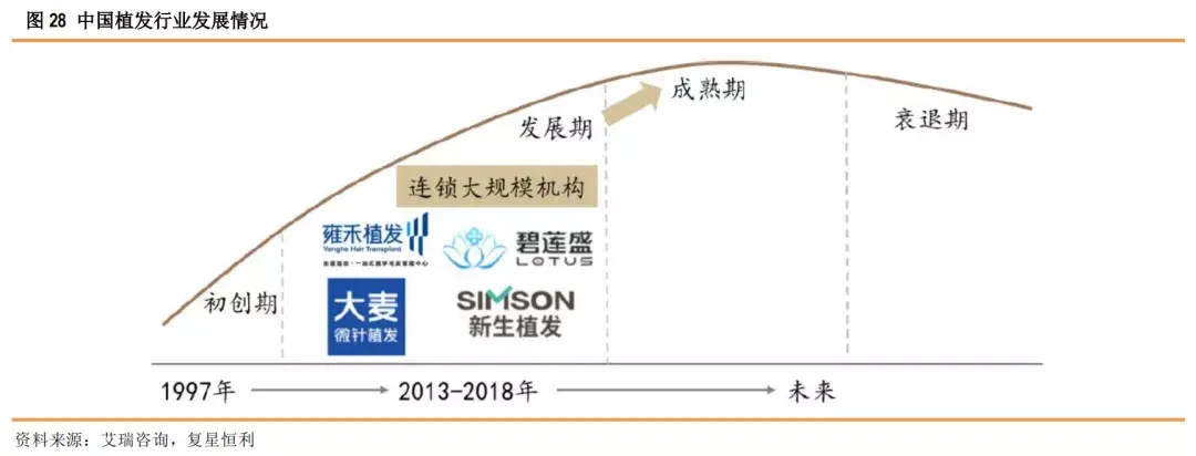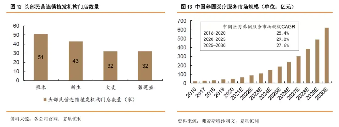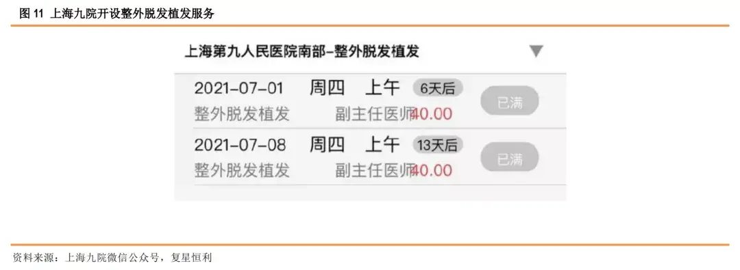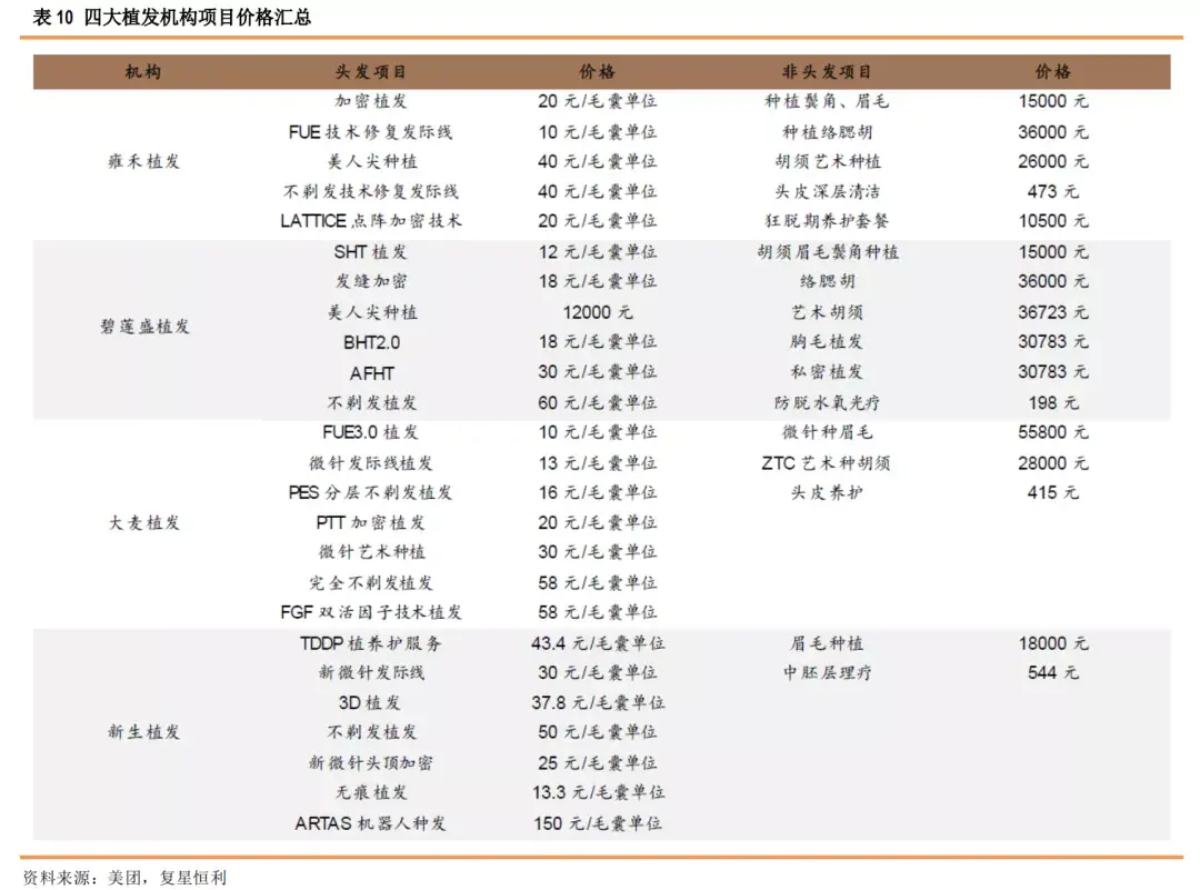 2)医美医院:植发科室偏重美学需求,多以自身医美客群为基础进行引流,未来在植发市占率预计持平现有的16%或微增。