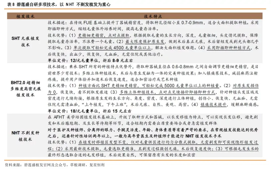 植发技术自进入中国市场出现了5次迭代升级,根据《毛发移植团体规范标准》,五次迭代技术分别为FUT、镊子种植、种植笔、即插即种、不剃发植发。现阶段在不剃发植发技术上做得比较领先的机构为碧莲盛,其他品牌也有不剃发植发技术,但大多需要部分剃发,未来消费者对于植发服务技术的诉求会越来越高,从过去只要能够长出头发逐渐升级为要求手术无痛无痕,再到无需剃发完全不会影响术后形象,只有技术不断迭代升级才能满足日益增长的消费者需求,而且不仅要满足已经产生的需求,还要走在消费者之前,才能引领行业进步。未来随着消费者的支付能力逐渐提升,其对于植发的需求不局限于达到生发效果,生活水平提高也催生了创口更小、痛感更轻微、恢复更快、减少术后尴尬等需求,未来植发技术将持续根据消费者痛点进行技术改良升级,催化行业持续发展。