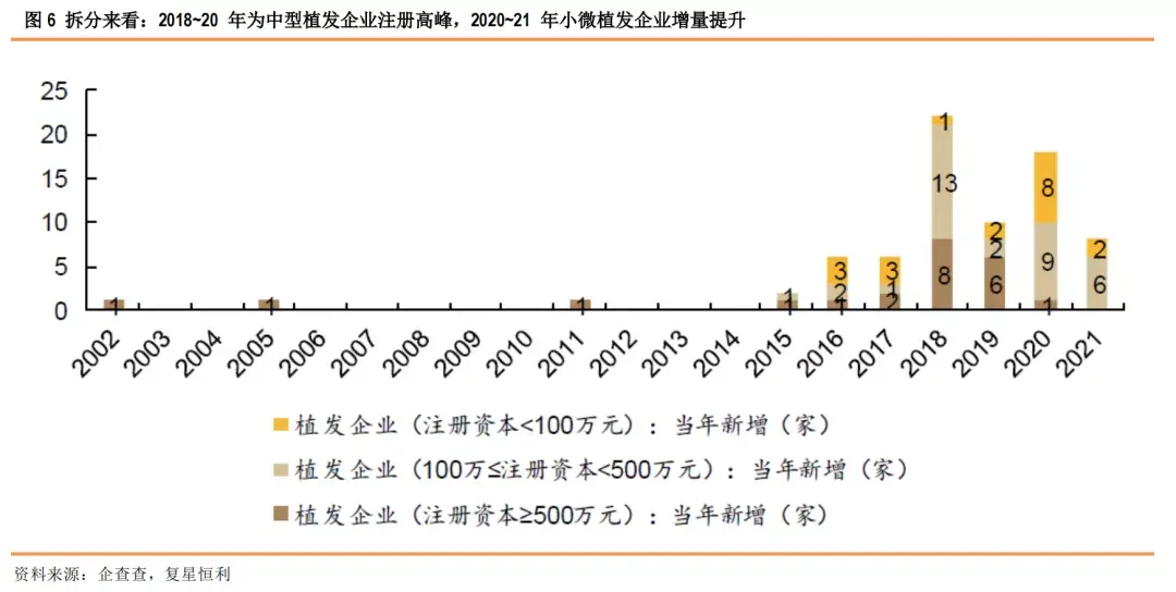 ①每年新增数量来看:通过对筛选和去重后的81家在运营企业进场数量来看,发现在2016年植发行业红利兴起后,新增注册的植发企业数量确实迎来了显著的增加,2016-21年合计新增76家(2016-2021年分别新增6家/7家/25家/11家/18家/9家),占存量总家数94%;②分拆企业来看:我们按照注册资本金额划分为3类:注册资本≥500万元、100万≤注册资本<500万元、注册资本<100万元。其中,2018-20年开始100~500万注册资本的企业,以及2020年注册资本低于100万以下的企业开始较显著增加。因此对于医生单独创业的现象,我们认为在行业内今年有发生但仍属于少数,因此,行业的植发门店新增量仍是以品牌连锁的植发机构为主。
