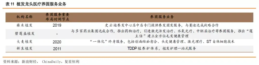 植发行业的特点在于消费者基本无复购需求,二次植发的消费者占比极低,当前龙头机构对外宣称的植发成活率已达到95%,随着技术的迭代及医师逐渐成熟,预计未来行业的成活率将持续维持较高水平。植发产业链逐渐延伸,从纯粹的植发向养发固发领域发展,普通头皮问题、脱发、毛发细软、斑秃发际线后退等头发问题,植发机构均可提供相应解决方案,养固服务业务线有利于多元化收入来源。新生医疗2011年推出TDDP植养护体系,2015年建立“全方位毛发养护管理体系”,提供“植发-养发-护发”一体化服务。雍禾医疗为造访医疗机构的患者提供一站式毛发医疗服务,通过就诊检测与诊断来判断患者头皮毛发问题严重程度,提供针对性的解决方案。针对脱发程度较轻不用植发的顾客,可推荐激光治疗、清洁护理等服务,并搭配公司的洗护产品、配方药品及居家礼盒销售,提升到店客户销售转化率。进而帮助公司从医美植发领域拓展至生美、日化领域,渗透广阔的养发固发市场,实现多层级市场参与渗透。