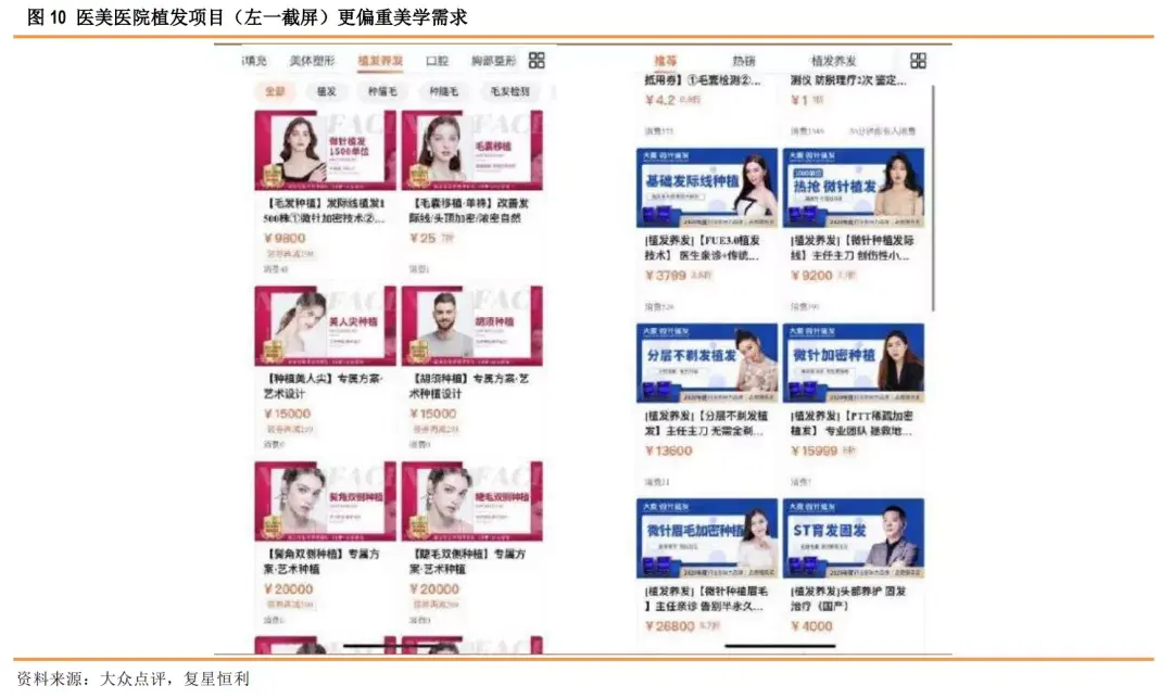 医美医院消费者客户画像相比于植发机构整体的人群画像,女性人群占比偏高,且对求美细节的要求更高,更偏重于发际线美观改善、美人尖种植、眉毛种植等进阶植发项目,特点为毛囊移植数量少但平均单价更高,且部分较多为一口价形式。由于医美医院的植发科室一般不会过多投放专项的植发营销及渠道费用,因此毛囊移植数量较少的女性消费者,同样能较好覆盖医美医院的经营成本。