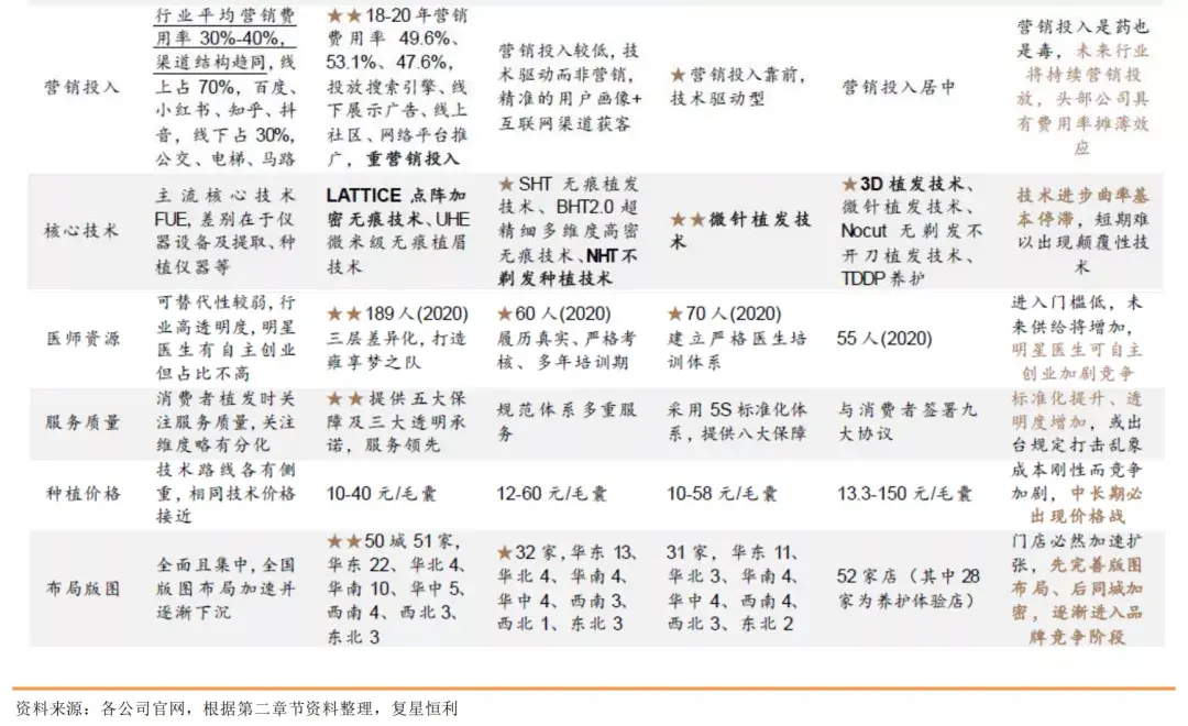 ▍2. 四大植发龙头对比,推演连锁型植发市场竞争格局