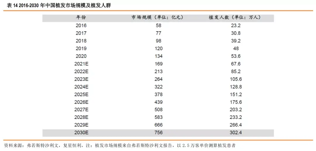 我们在6月22日发布的《植发行业|深度报告:从雍禾IPO,看植发产业大发展》报告中提到,中国植发医疗服务市场由2016年的58亿元增至2020年的134亿元,年化复合增速达23.3%,市场高增长得益于三大驱动力: