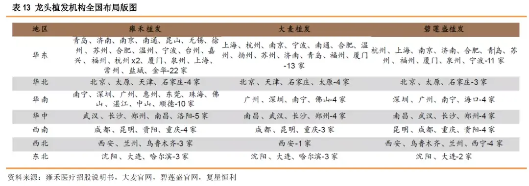 龙头植发机构在过去两年内基本遵循“一城一院”的原则进行全国快速布局,招股说明书披露雍禾植发已布局51家门店,大麦植发门店32家、碧莲盛门店32家,头部植发机构几乎实现全国布局。从项目具体分布地址来看,华北、华中、西南、西北及东北五大片区的布局基本相似,城市重合度较高,考虑到城市的消费水平及植发需求,机构集中在一线城市及省会城市进行布局。而雍禾在华东及华南地区进行加密布局,华东已布局22家、华南10家,较大麦及碧莲盛领先,城市下沉趋势明显,例如进入惠州、中山、顺德等地,在脱发现象普遍和植发需求旺盛的大社会背景下,低线城市植发市场几乎空白,雍禾战略性规划扩张以覆盖更多低线城市,抢占市场高地,有效满足各层级客户的相关需求。