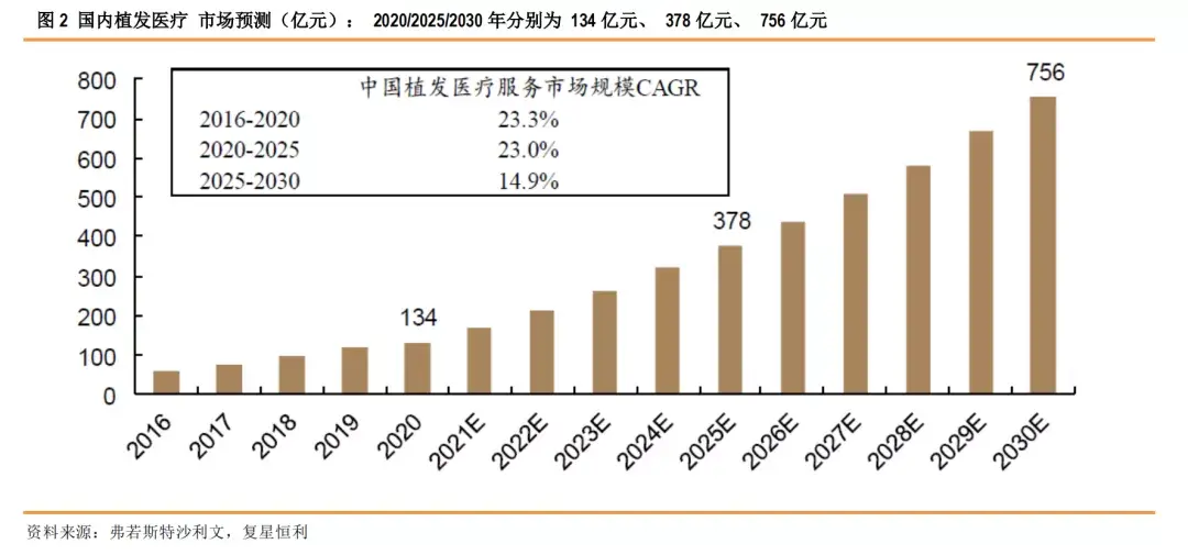 弗若斯特沙利文预计我国植发医疗服务市场2025年将达到378亿元,2020-2025年复合增速达23.0%,该阶段主因消费者教育进入兑现期;2030年市场将达756亿,对应2025-2030年复合增速下降至14.9%,考虑市场基数逐渐提升且植发多为一次性消费,预计未来的增速将略有放缓。