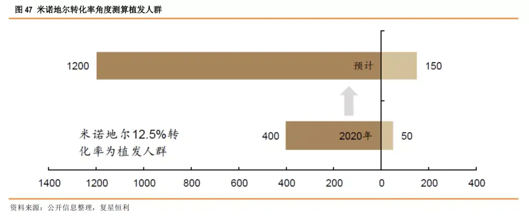 市场空间测算:基于米诺地尔中期客群1200万人二阶推算,预计对应植发人数150万人和375亿市场空间。