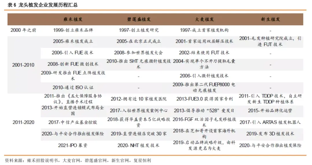 首家植发机构开设于1997年,并于同年引入FUT技术,2001年起开始运用双层解压技术,于2002年停止使用FUT技术;2006年从国外引入微针植发技术,在后续陆续进行5次自主更新升级,在国内植发行业处于领头地位;2016年在资本进入市场后,公司领头地位逐渐被雍禾、碧莲盛等赶超;2018年公司在美国芝加哥开设首家海外植发机构;2019年后公司名由原本“科发源”植发更改为“大麦”植发,启动品牌升级战略,增加消费者辨识度。