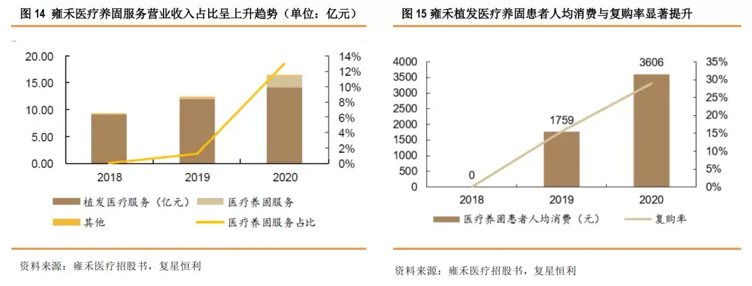 以雍禾植发为例,旗下服务已形成“诊断、治疗、养固、植发、假发”于一体的一站式医学毛发管理服务体系,囊括脱发门诊、药物治疗、史云逊健发中心、雍禾植发和哈发达假发研发生产中心等部门。由于医疗养固服务类型多样,能满足不同脱发阶段的患者,因此其具有相当数量的潜在用户。在机构的到店客户中,目前仍有较多脱发人群无法接受植发手术项目,或者由于个人原因选择非手术类项目,尝试更为保守的方式解决脱发问题,可见多元化毛发管理能有效提升到店术前客户转化率。同时,养固发服务通常需要一个及以上疗程方可见效,再搭配推销日化产品(如防脱精华、防脱洗发水等),可持续带给机构多样化收入,每个套餐在1-2万元。以行业龙头雍禾医疗为例,旗下的养固服务收入占比近年来逐渐提升,2020年医疗养固服务登记患者人数达59122人,人均消费由上年的1759元提升至3606元,复购率由15.6%提升至28.9%。综上,养固发项目具有高客单价与高复购率的特点。