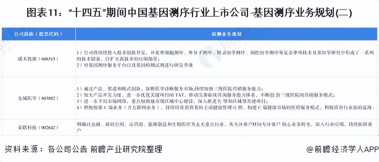 根据《第十四个五年规划和2035年远景目标纲要》,基因与生物技术被确定为国家强化国家战略科技力量,加强原创性引领性科技攻关的七大科技前沿领域攻关领域之一;同时,基因技术也被列为国家战略性新兴产业的未来产业。未来,我国基因测序行业上市公司的规划主要围绕着提升检测技术、开发检测平台以及拓宽新客户开展。
